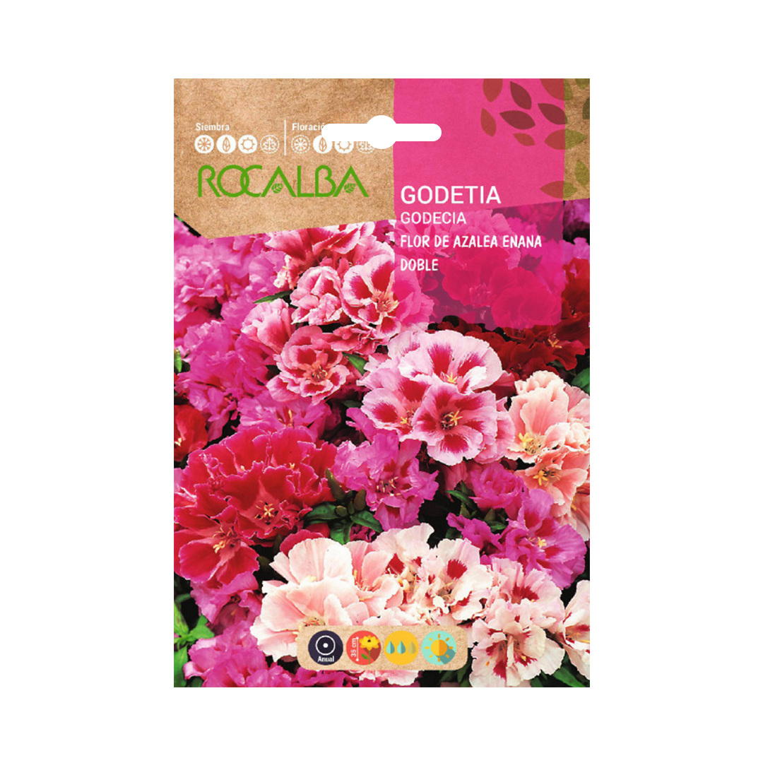 La variedad Enana Doble produce plantas anuales compactas de 20-35 cm con flores dobles en tonos rosas, rojos o bicolores. De lejos, su flor es muy parecida a la de las azaleas, por lo que también suelen llamarla Flor de la Azalea. Las godetias florecen abundantemente desde principios del verano hasta el otoño.